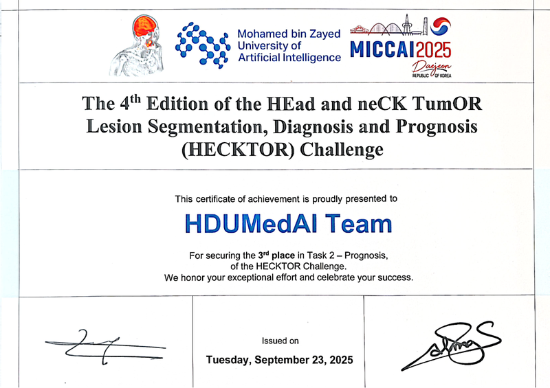 2025年9月23号,医学图像计算与计算机辅助介入领域的国际顶级会议MICCAI(MedicalImage在Computing and Computer Assisted Intervention)在韩国大田拉开帷幕。由秦飞巍教授指导的圣光机学院本科生HDUMedAI团队2024级吴贝柠、陈亦雷等同学从全球众多参赛团队中脱颖而出,在第四届头颈部肿瘤分割、诊断与预后挑战赛上荣获全球第三名,这也是我校首次在该赛事获得奖项。MICCAI由国际医学图像计算和计算机辅助干预协会(Medical Image Computing and Computer Assisted Intervention Society)举办,是跨医学影像计算(MIC)和计算机辅助介入(CAI)两个领域国际公认的最具影响力的学术会议。2025年会议共收到投稿3667篇,仅排名前9%的论文获得提前录用资格。圣光机学院高度重视学生创新能力培养,以本科生实训基地为抓手,精心打造了一套完善且多级的本科生科研素质培养体系,引导本科生从低年级阶段起就开始接触科研前沿领域、积极参与创新实践,全面培养学生的创新精神与科研能力。学院将以此为