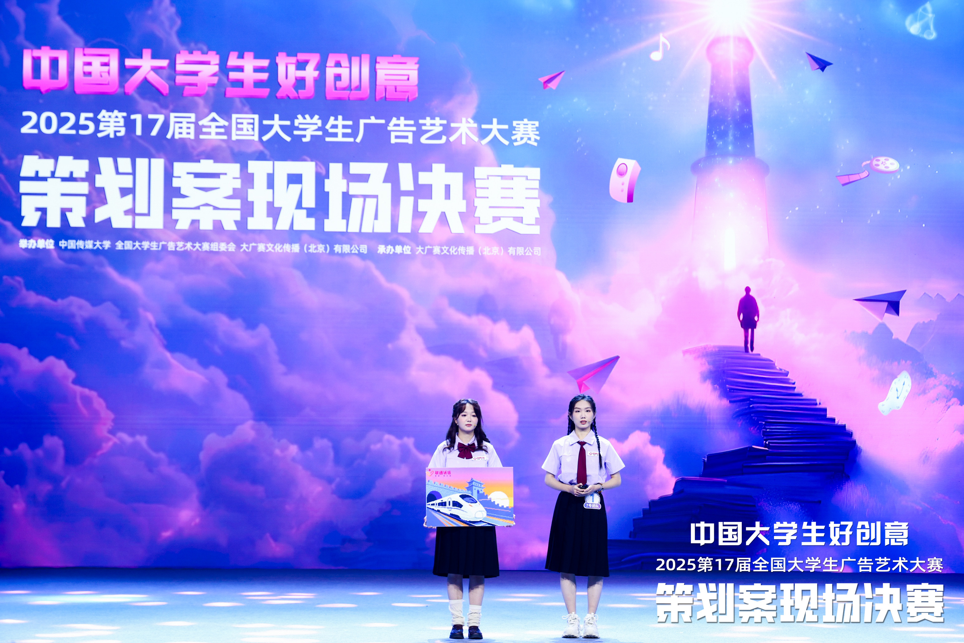 在刚刚结束的第17届全国大学生广告艺术大赛(大广赛)策划案现场决赛中,由大二学生屈蕙孜、窦匀培组成的团队,凭借卓越的策略思维与出色的现场提案表现,荣获国赛一等奖,其作品《青春无界,沃行千里》以深刻的消费者洞察与创新的传播策略,在激烈竞争中脱颖而出,赢得评委团的高度评价,实现了我校大广赛策划案国赛一等奖“零的突破”。全国大学生广告艺术大赛是规模大、覆盖面广、参与高校多、作品水准高的国家级A类学科竞赛,迄今已成功举办17届。作为分量最重的策划案类赛道,本届大赛共收到来自近1900所高校的策划案作品共计20622组,经过多轮严格评审,最终仅14组分别来自14个命题单位的作品进入现场提案答辩,并最终决出一等奖10组,充分体现出竞赛的极高难度与权威性。这份荣誉不仅是对两位参赛同学和指导老师李婷、王松以及人文艺术与数字媒体学院、法学院大广赛指导老师团队在策略构思、创意发散与实战应用方面的综合能力的肯定,更是我校长期以来注重创新能力与实践教学融合成果的集中体现。近年来,人艺数法学院持续推进一流本科专业建设,不断深化教学改革,依托优质的实践平台与学科竞赛机制,配备经验丰富的导师团队,全面培养学生的创意