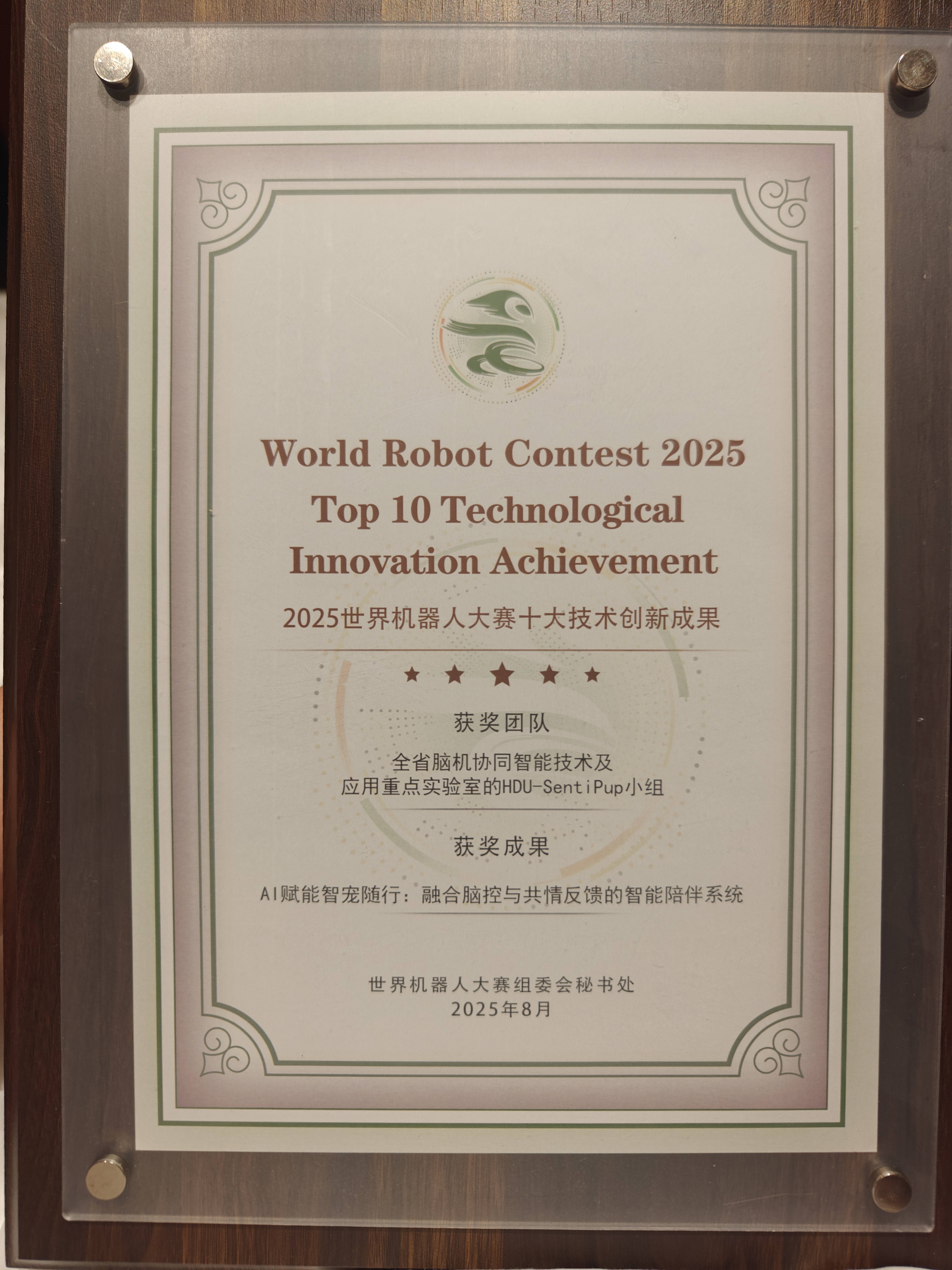 2025年8月8日-12日,2025世界机器人大赛北京锦标赛在北京北人亦创国际会展中心隆重召开。我校计算机学院脑机协同智能实验室在本届世界机器人大赛中大放异彩荣获““2025世界机器人大赛十大技术创新成果”一项,此外还在脑机接口专项赛道获二等奖、三等奖各一项。AI赋能智宠随行:融合脑控与共情反馈的智能陪伴系统。由计算机学院脑机协同智能实验室的金磊、戴嘉如、单栩超三位研究生和计算机学院刘卓然、张裼旭两位本科生组成的HDU-SentiPup队伍,在孔万增教授、朱莉副教授两位老师的指导下开发的《AI赋能智宠随行:融合脑控与共情反馈的智能陪伴系统》,荣获“2025世界机器人大赛十大技术创新成果”,国家自然科学基金委信息学部等领导为获奖团队颁奖。该系统聚焦于智能陪伴产品的“情绪-运动协同”理念,研发出一款兼具主动脑控与被动情绪感知功能的智能机器狗。用户不仅可以通过稳态视觉诱发电位(SSVEP)实现对机器狗的主动控制,系统还能够实时监测用户脑电,感知用户的情绪状态。当用户处于消极情绪时,系统将借助大语言模型生成具有共情色彩的音乐反馈,向用户提供情绪化反馈,实现了人机交互从“被动执行”到“主动理解与